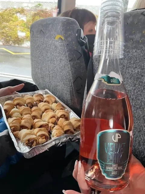 Auf dem Weg Postauto Richtung Moosalp, liess Doris die Korken knallen und so beglückte sie uns mit einem Gläschen Prosecco und selbstgebackenen Schinkengipfeli!