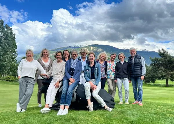 Von den 28 angemeldeten Ladies mussten leider drei aus gesundheitlichen Gründen kurzfristig absagen – ihnen wünschen wir auf diesem Weg gute und baldige Besserung! 23 Ladies trafen sich früh morgens in Eyholz, wo der Reisecar von Zerzuben bereitstand, zwei Ladies reisten via Gotthard, so waren wir total 25 Ladies. Mit einer halben Stunde Vorsprung aufs Reiseprogramm traf der Car in Le Robinie ein und es entstieg eine Gruppe fröhlicher Golferinnen, denen die Vorfreude anzusehen war. Nun blieb ausgiebig Zeit die Golf Trolleys bereitzustellen, die Zimmer zu beziehen und einen gemütlichen Apéro auf der Terrasse des Restaurants zu geniessen, den uns Christine Aufdenblatten zu ihrem Einstand bei den Ladies bescherte. Vielen herzlichen Dank liebe Christine, wir freuen uns, dass du bei den Ladies dabei bist!